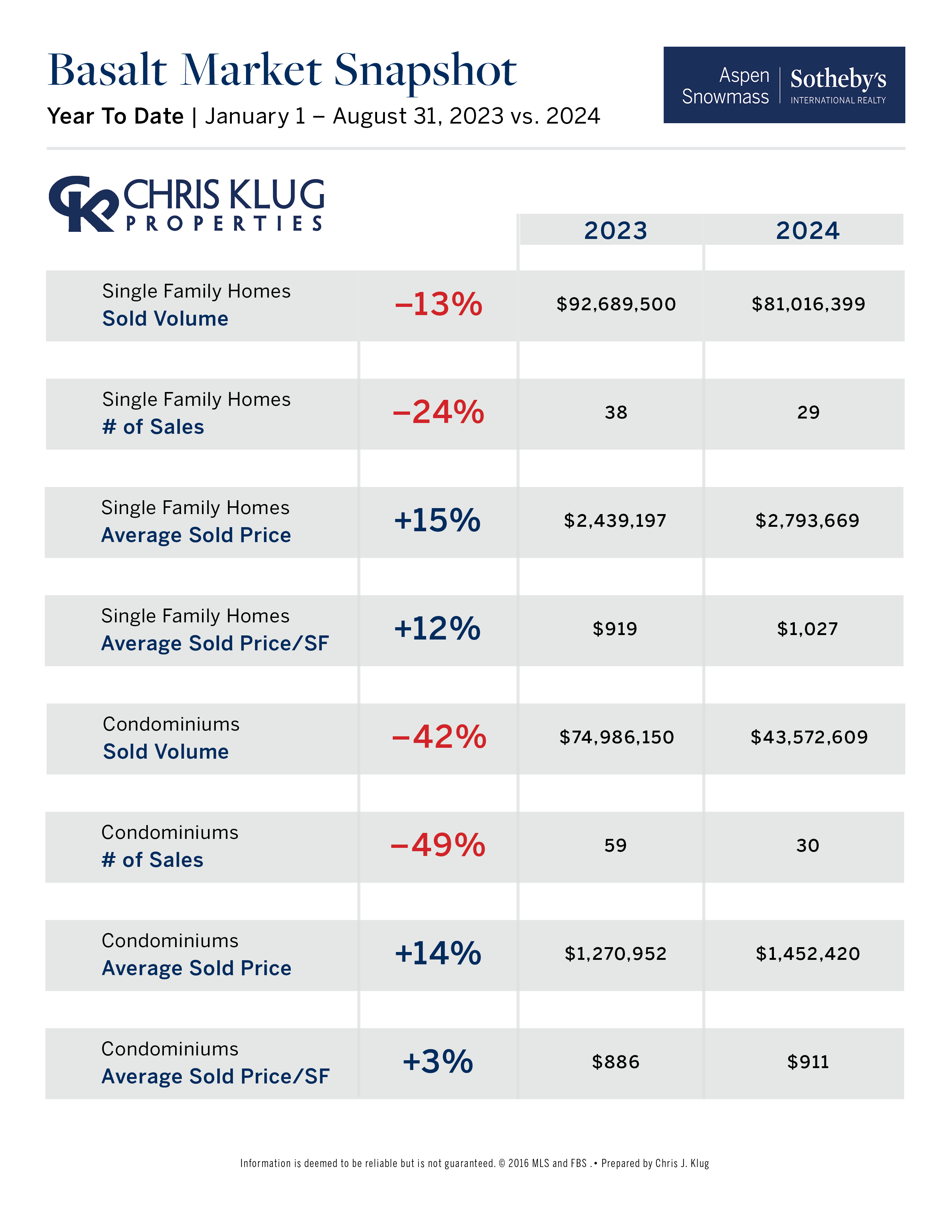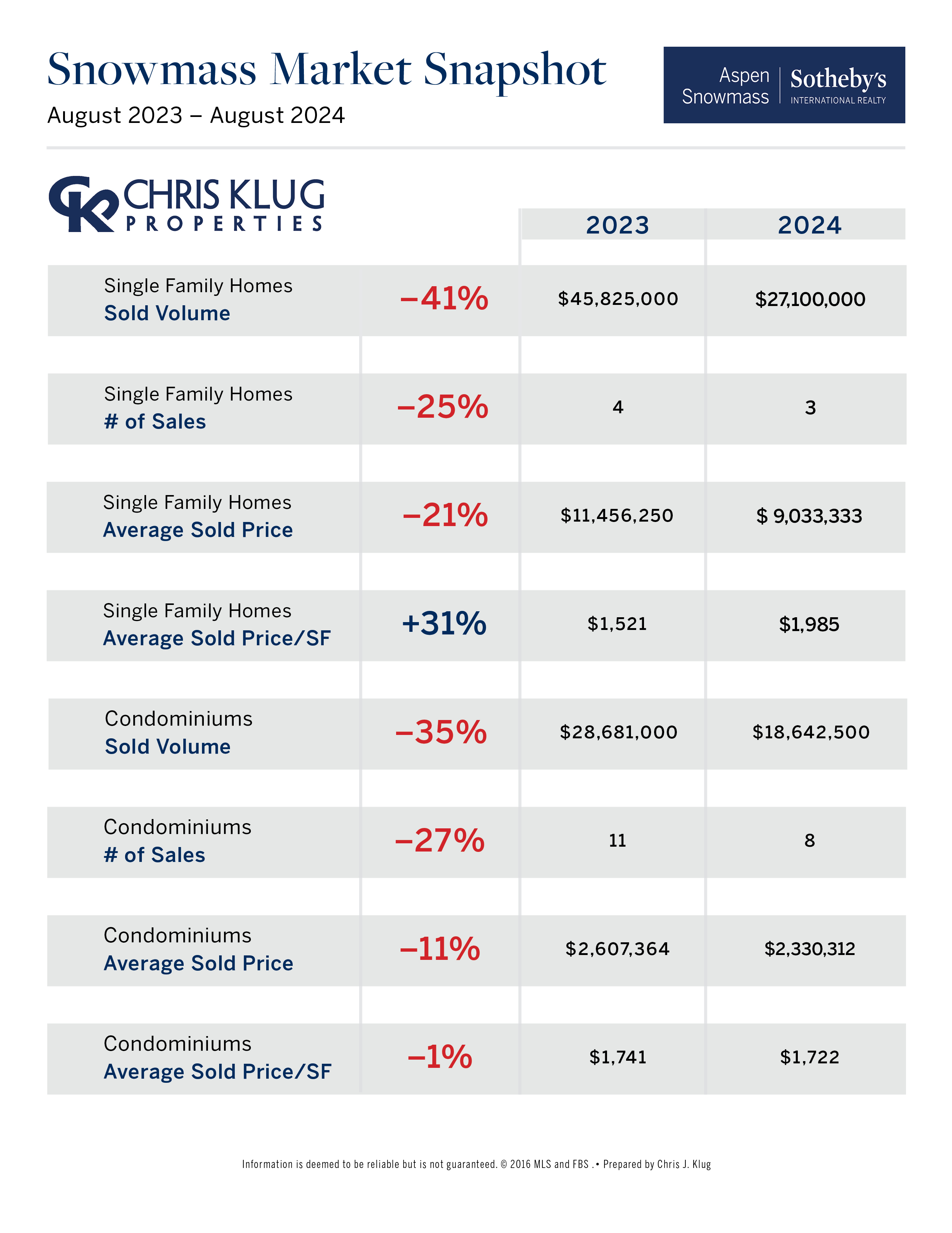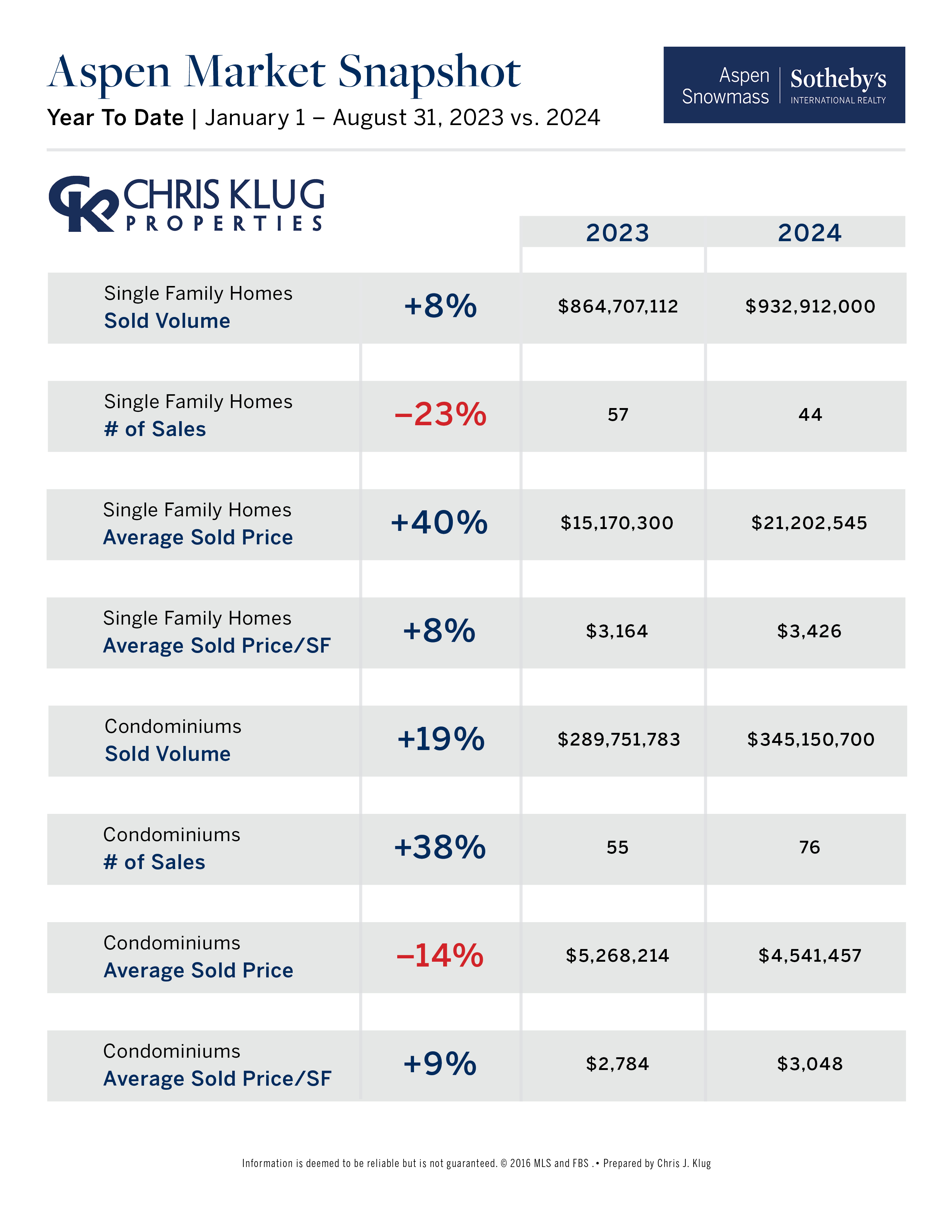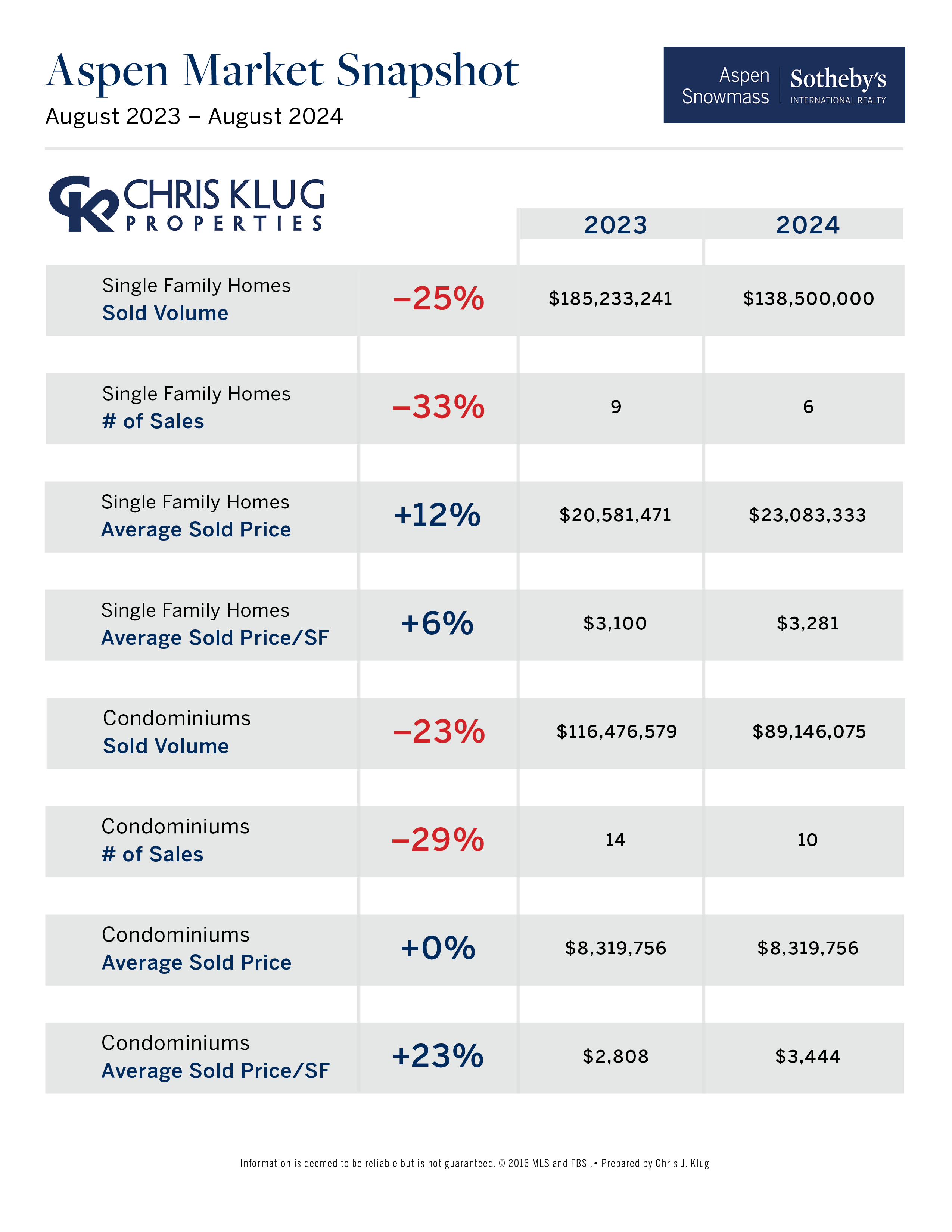 - In August 2024, there were fewer sales of Aspen single-family homes and condos compared to August 2023, but prices have shown strength.