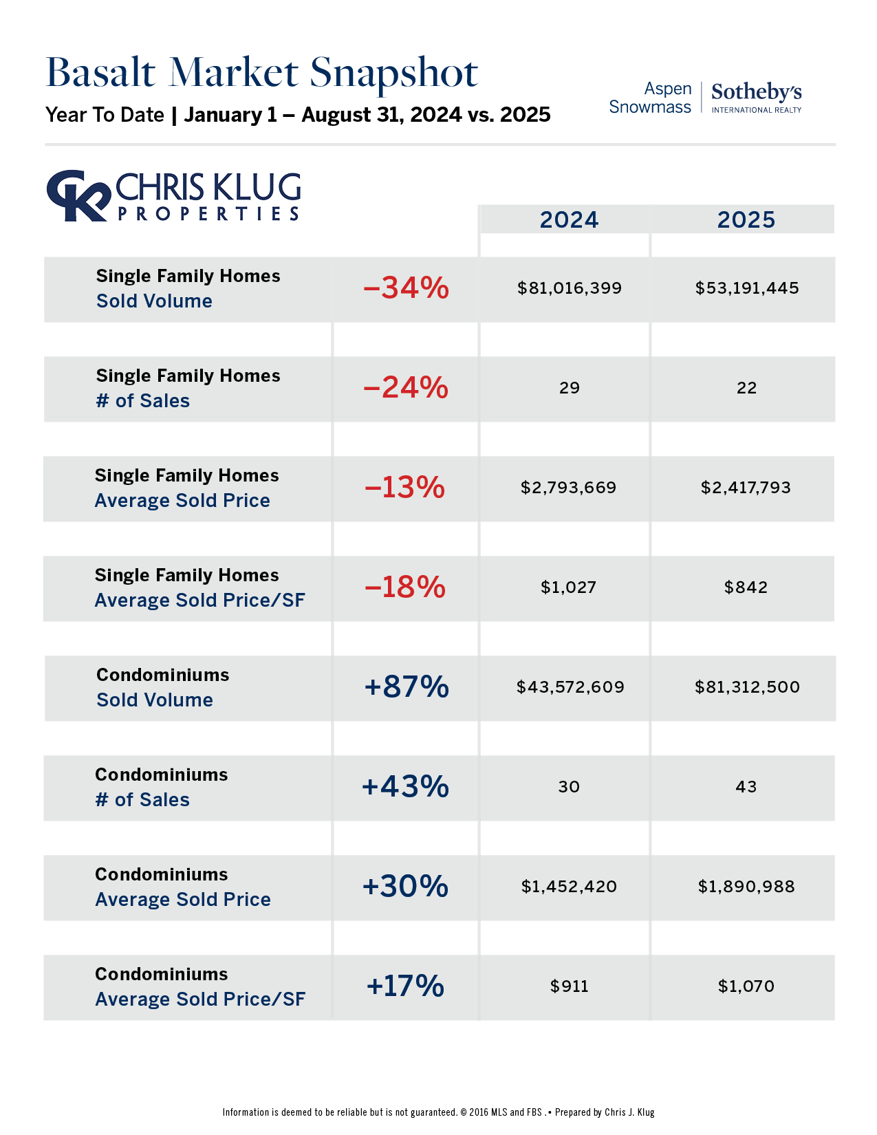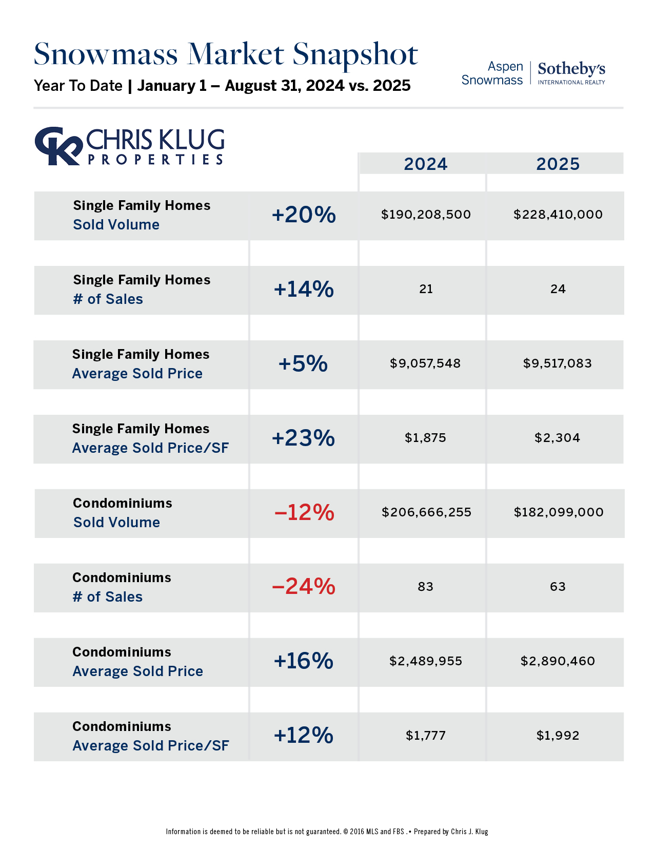 August brought a tale of two markets in Aspen Snowmass. Aspen slowed sharply, with fewer single-family closings and a pullback in sales volume, though condo price per square foot continued to rise. Snowmass demonstrated greater resilience, as evidenced by stronger single-family activity and sharp price gains in condos, despite fewer overall transactions. Inventory shifted meaningfully year-over-year — Aspen listings remain modestly below last summer and well off pre-pandemic highs, while Snowmass condo supply spiked versus 2024 but is still far leaner than 2019. These dynamics underscore the continued strength of A+ properties and the long-term supply constraints shaping our market.