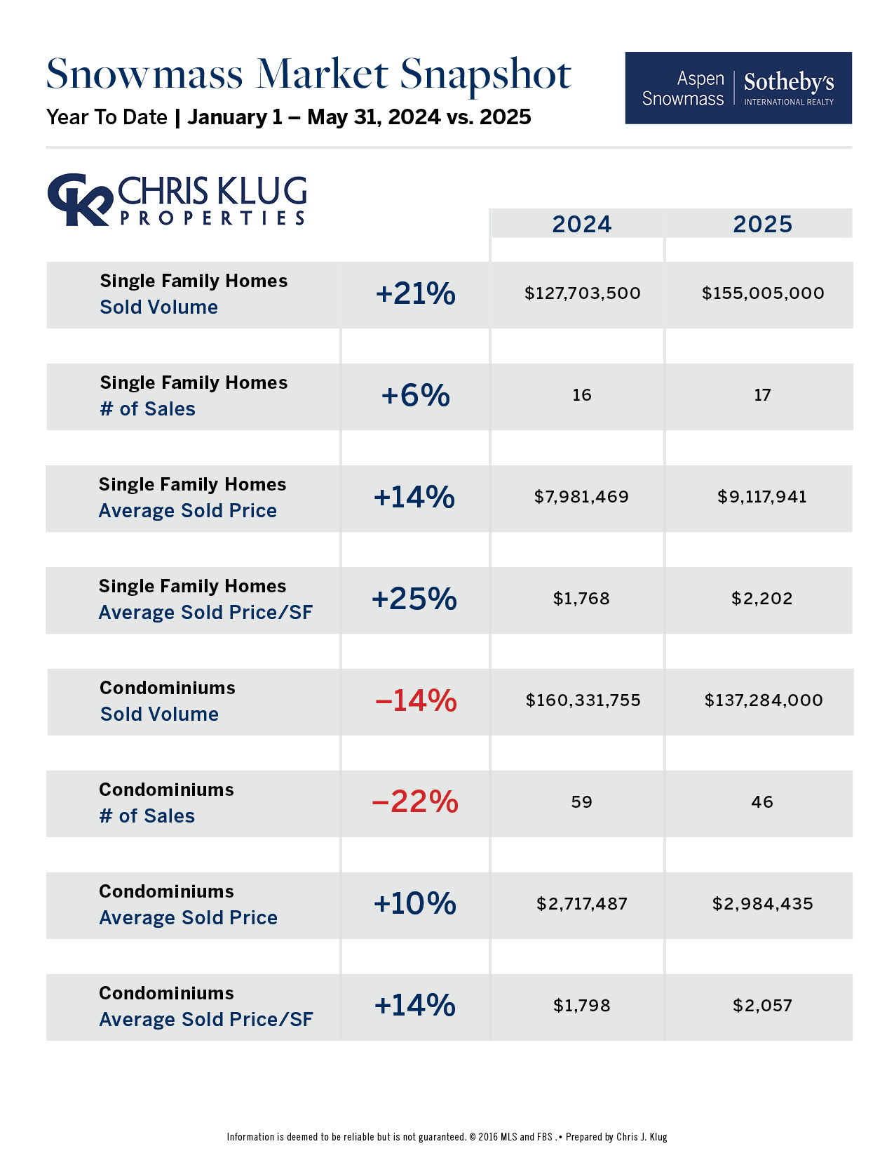 Snowmass Village single-family homes saw a 21% rise in volume and a 6% increase in transactions, with the average sold price up 14% to $9,117,941 and the average sold price per square foot rising by 25% to $2,202.