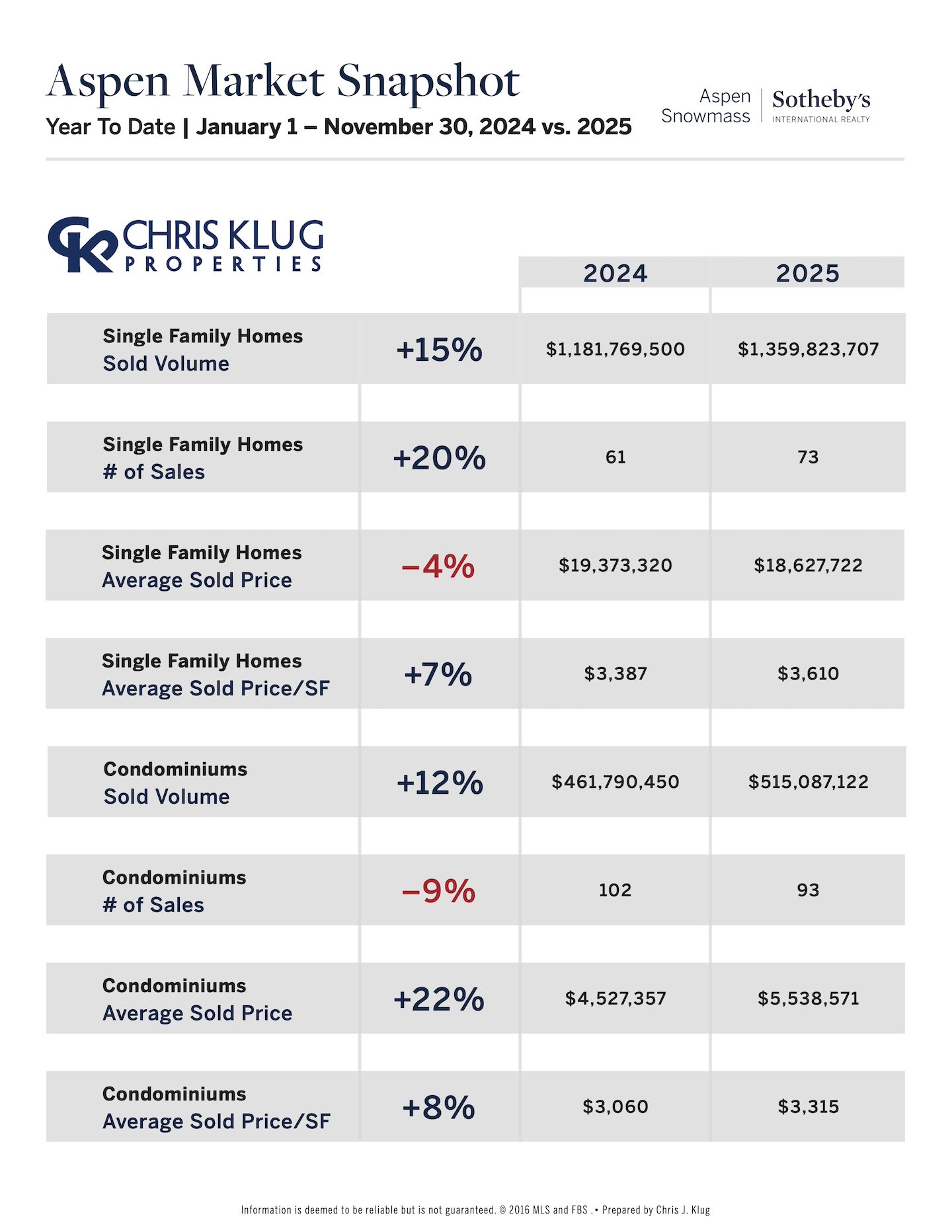 The Aspen Snowmass real estate market remains very strong as we head toward year-end. We’re on track for a great finish to 2025 and an excellent start to 2026. Inventory is still tight, and sales continue to outpace last year. The high end leads the way, with 78 sales over $10 million so far—up from 68 a year ago, a 15% increase. Year-to-date, 29 properties have sold above $20 million compared to 23 last year, a 26% jump. These numbers do not include several off-market trades. Snowmass continues to offer relative value, with average prices less than half of Aspen’s. While true “checks all the boxes,” inventory remains limited, shifting feeder markets and broader economic and political forces make accurate pricing and strategic positioning more important than ever. Sellers should remain open to negotiation, especially where compromises exist. It has been a fantastic 2025, and with a historically tight supply, upcoming improvements, and sustained demand, I’m optimistic 2026 will start just as strong.