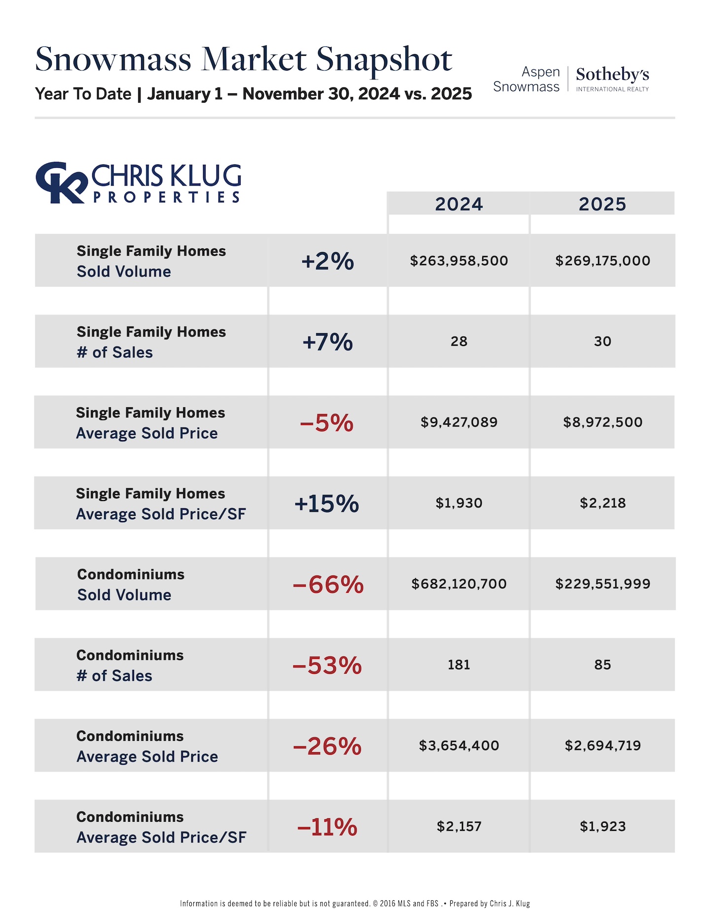- Snowmass condo sales are down significantly, with no Cirque or Aura sales this year compared to last fall. Both dollar volume and transaction count are roughly half of last year’s. The average sold price is $2.6M, with an average sold price per square foot of $1,923.
